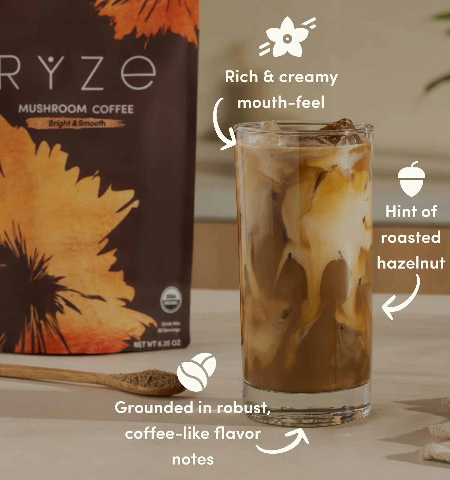 Ingredients: Organic Instant Coffee, Organic RYZE Super6™ Mushroom Blend (Cordyceps, Reishi, Turkey Tail, King Trumpet, Shiitake, Lion's Mane), Organic Prebiotic Blend (Acacia Fiber, Inulin Fiber, Tapioca Fiber).